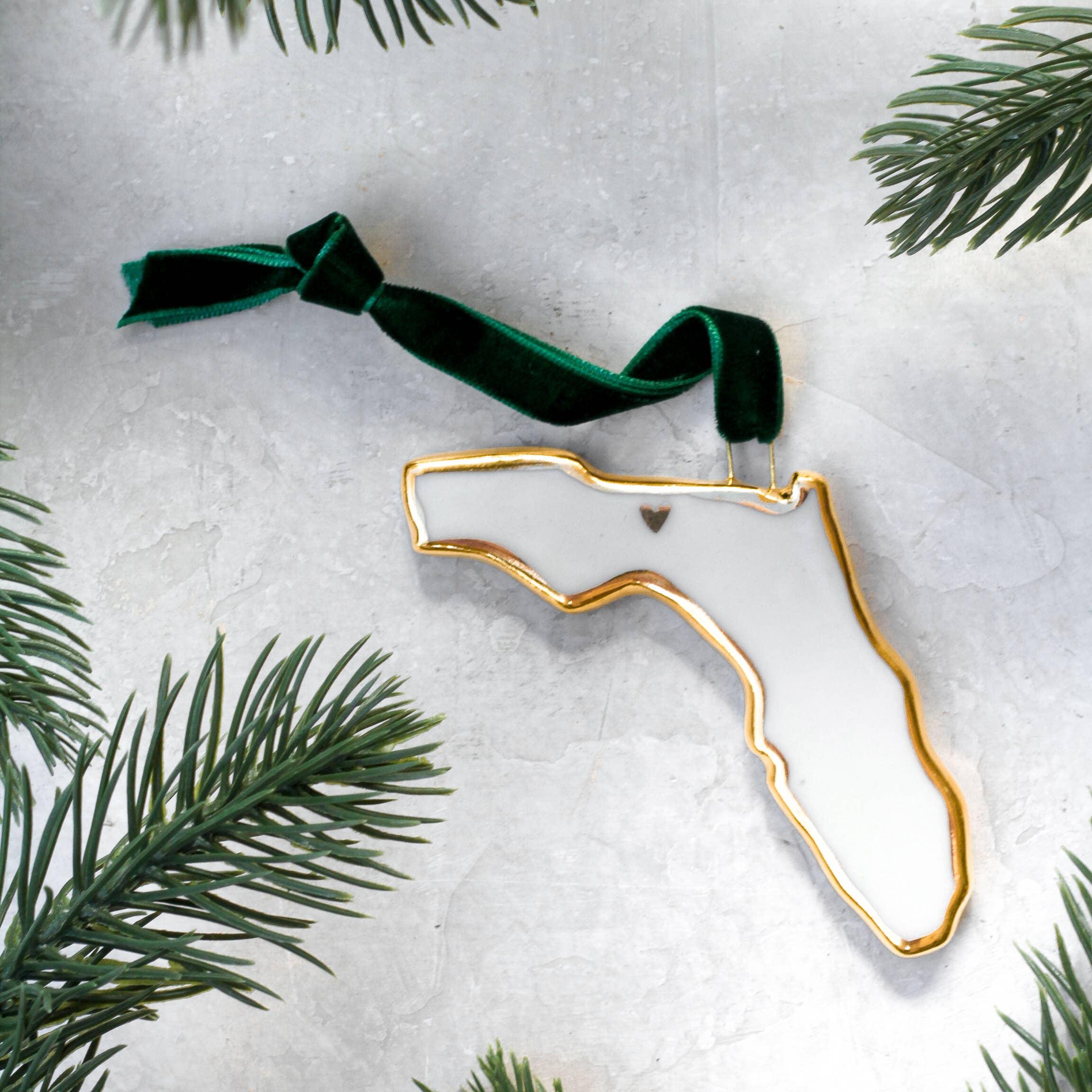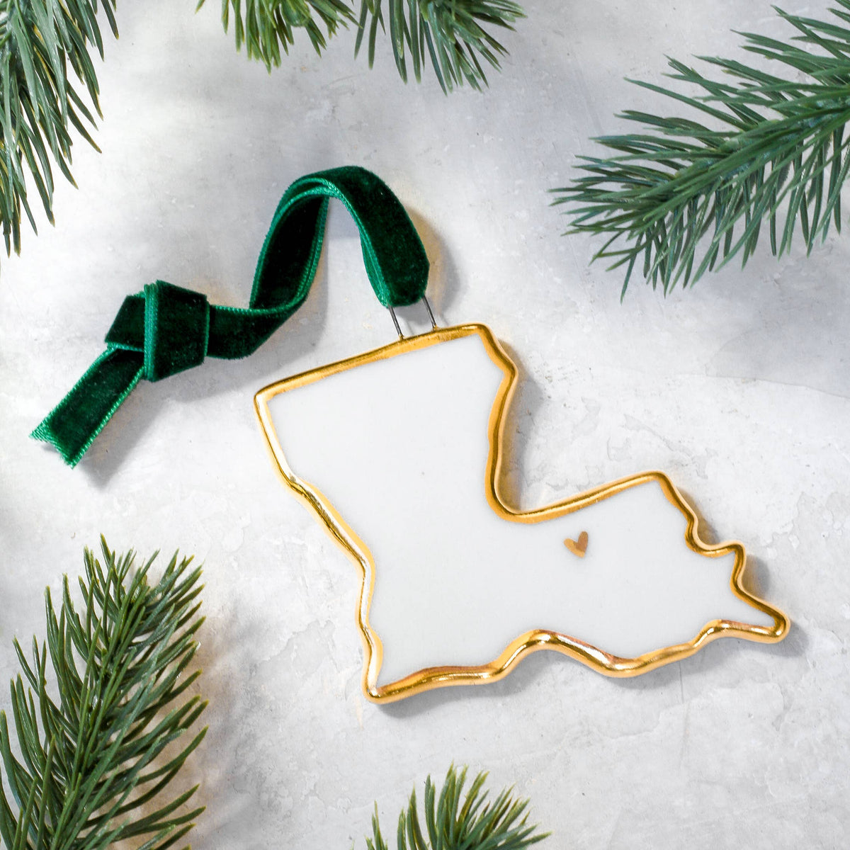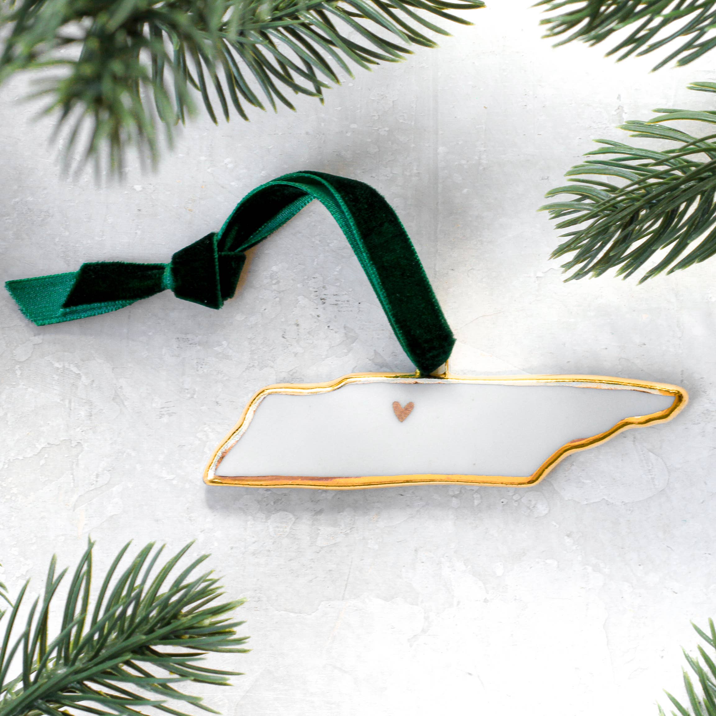 Celebrate your state pride with these beautiful porcelain ornaments, each handmade in the shape of a beloved U.S. state. Outlined in luxurious 22k gold luster, these ornaments capture the elegance and charm of the season, making them perfect for holiday decorating or year-round display. Each ornament features a delicately placed gold heart on the capitol. The ornaments are suspended from a velvet green ribbon. Whether you're celebrating your home state or gifting a piece of someone's personal history, these state-shaped ornaments are a beautiful way to honor the places that mean the most. If you’d like to see your individual state, please head over to the individual state listing.