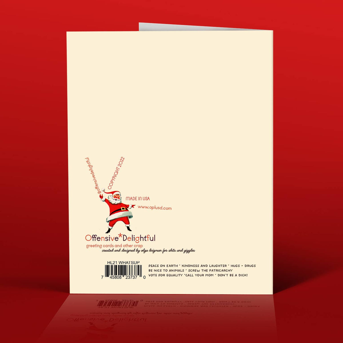 Style No. HL21 "What's up Bitches!" Funny christmas greeting card, Happy holidays card, Santa riding a magic carpet dropping presents, christmas card, funny holiday cards, funny santa claus being cool.